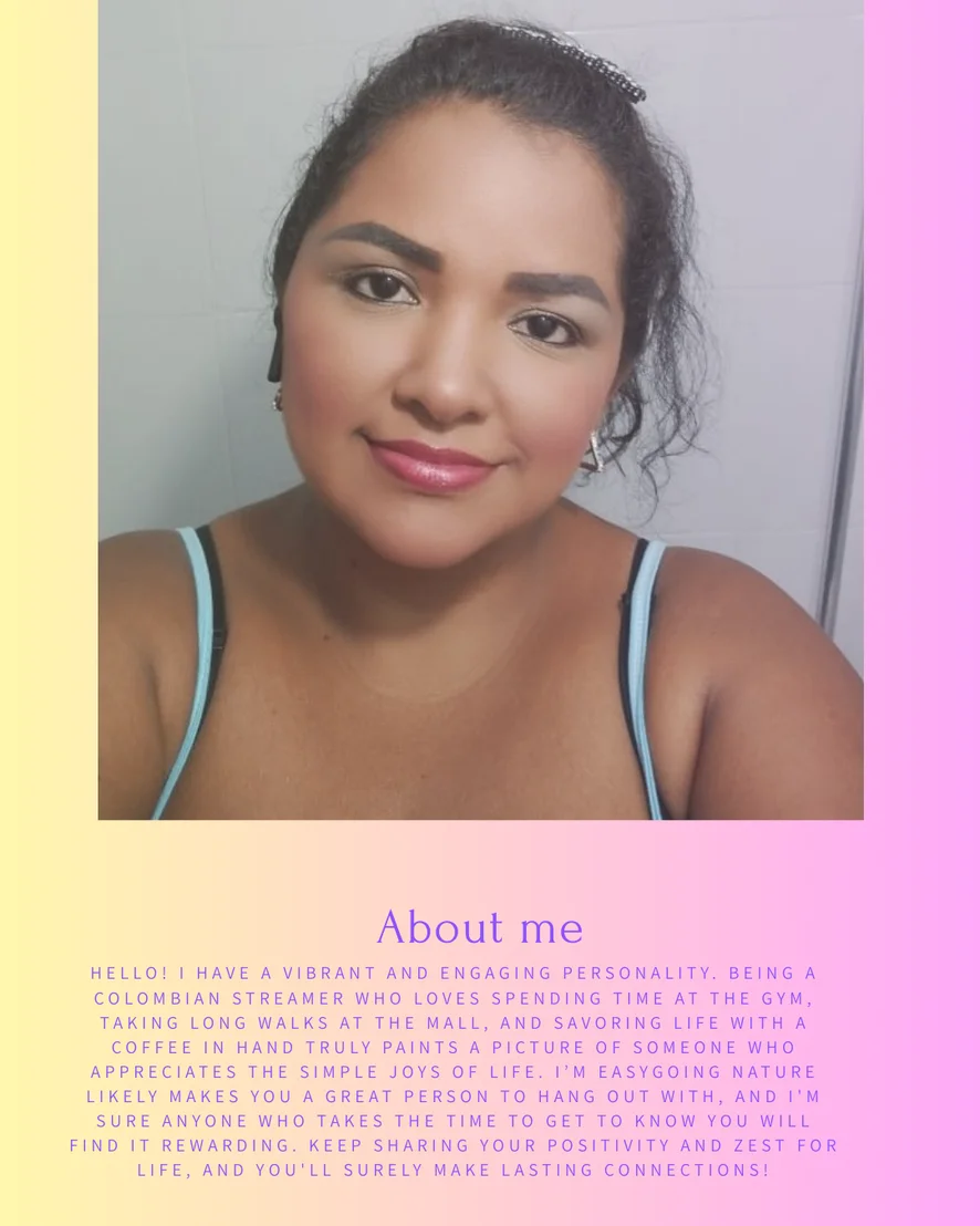 Hello! I have a vibrant and engaging personality. Being a Colombian streamer who loves spending time at the gym, taking long walks at the mall, and savoring life with a coffee in hand truly paints a picture of someone who appreciates the simple joys of life. I’m easygoing nature likely makes you a great person to hang out with, and I'm sure anyone who takes the time to get to know you will find it rewarding. Keep sharing your positivity and zest for life, and you'll surely make lasting connections!